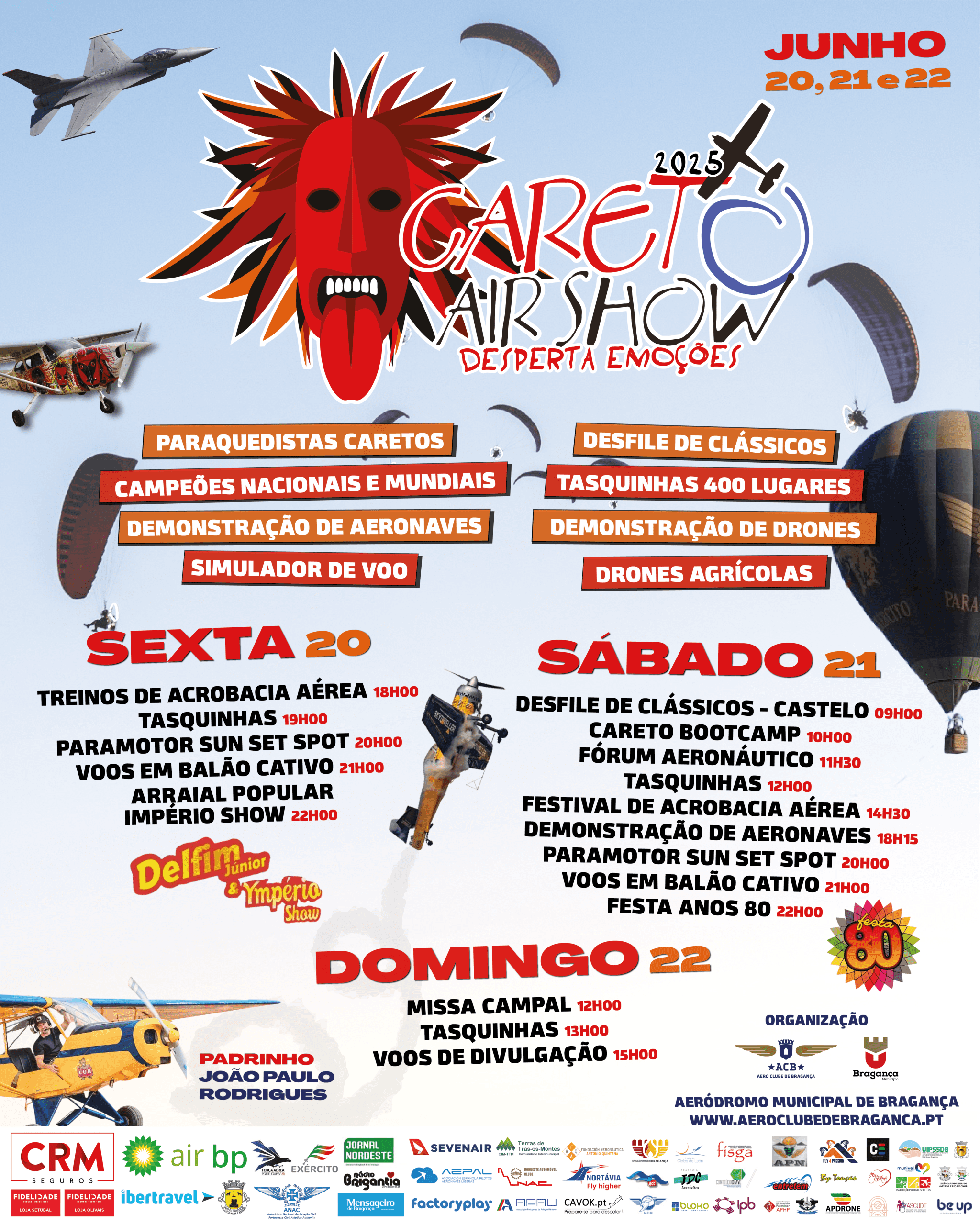 O evento tem agora três dias de programação e conta com paraquedistas vestidos de caretos, espéculos acrobáticos com “os melhores do mundo”, demonstrações, voos de divulgação e muito mais. Em terra há workshops, exposições de aeronaves, de artesanato, simuladores. As crianças têm sempre uma zona dedicada com insufláveis e muitos jogos aeronáuticos.